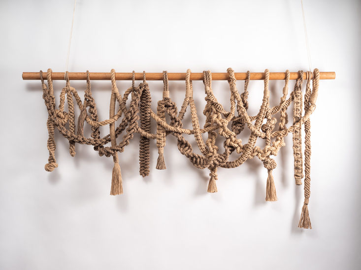 An abstract wall hanging made from cotton, jute, or wool, Gravata makes a bold statement in both horizontal and linear orientations. Suspended on solid oak or walnut hangers, this piece is customizable in width and height, allowing it to be perfectly tailored to any space.